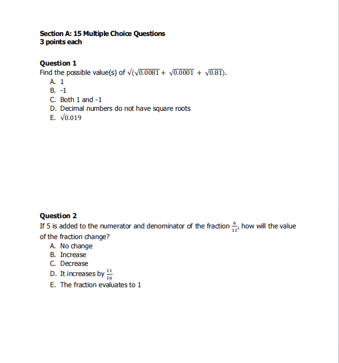 A 部分:第 1 至 15 题,每题 3 分,未作答或答错不扣分。